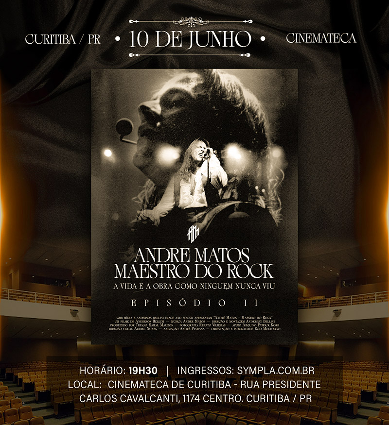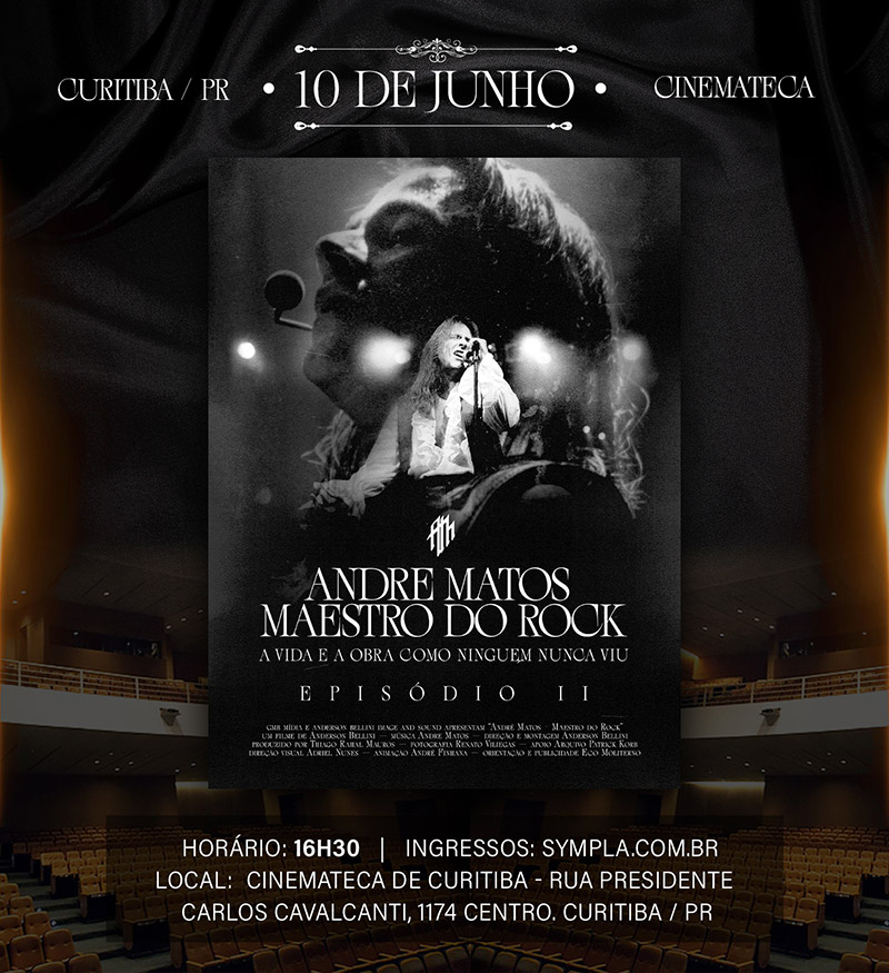 “Andre Matos – Maestro do Rock” terá duas sessões em Curitiba, no dia 10 de junho, na Cinemateca. Os ingressos estão à venda por 35 reais (meia e promocional, mediante doação de 1 quilo de alimento não perecível ou ração para cães ou gatos) através da plataforma Sympla (Sessão 16h30 / Sessão 19h30).