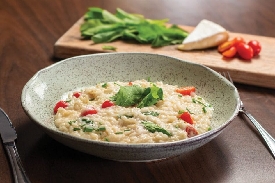 Outra opção que promete conquistar os paladares é o Risoto de Brie. Preparado com arroz arbóreo cremoso, o prato é enriquecido com queijo Brie, tomates cereja frescos e folhas de rúcula, oferecendo uma combinação de sabores sofisticados e marcantes.