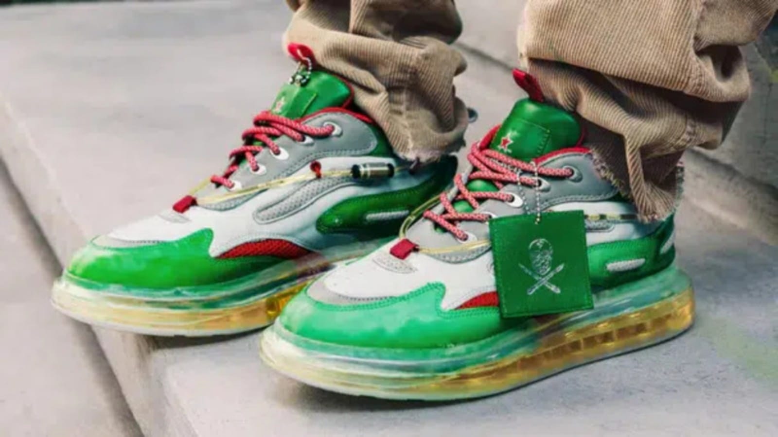 O tênis possui a cerveja Heineken Silver na sola, acrescentada por intermédio de uma injeção especializada.